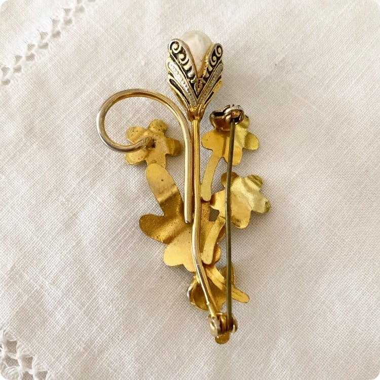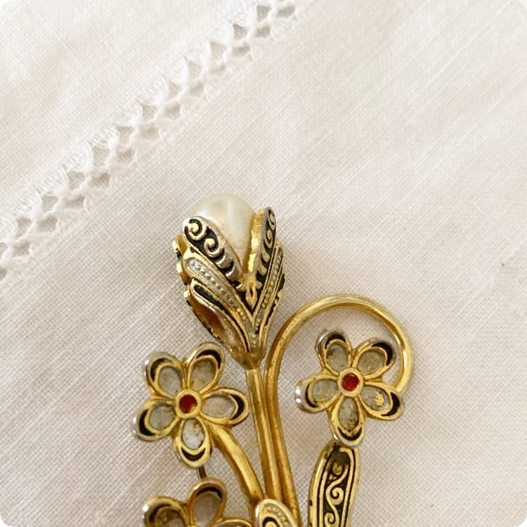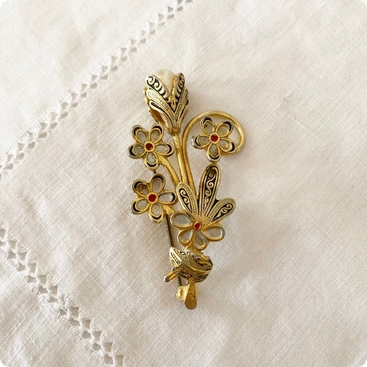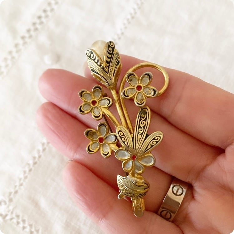 フランスヴィンテージ ブローチ | 花柄&パール ダマスキナード風 ゴールド×ブラック |1940-50