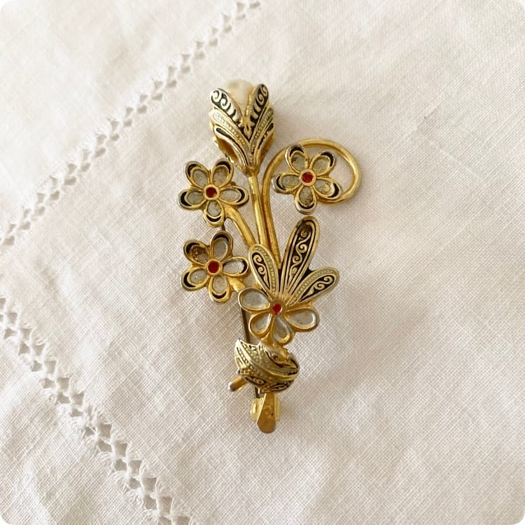 エレガントでクラシカルな雰囲気が漂うこのブローチは、装飾品としてだけでなく、特別な日の装いを引き立てるアクセントとしてもぴったりです!