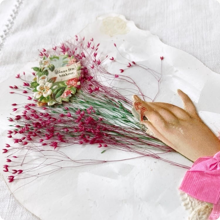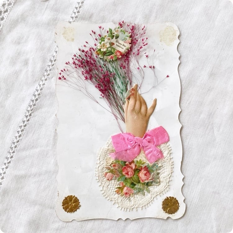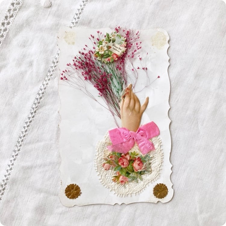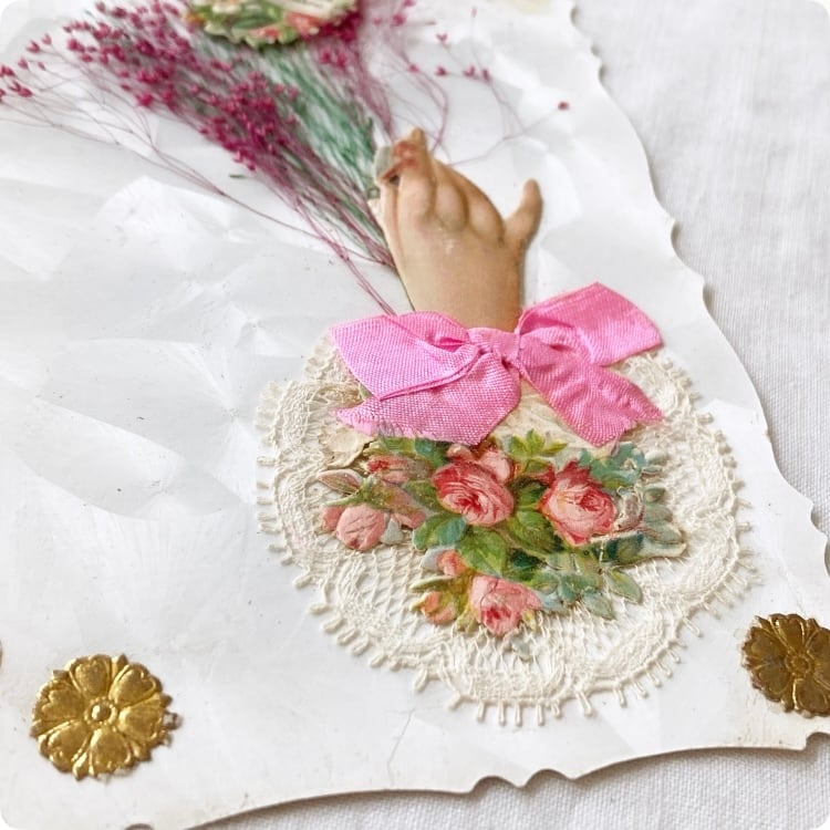 ヴィクトリアン・ハンドと呼ばれる、「手」のモチーフや、エンボス加工、ドライフラワーなどが使用されており、非常に楽しいアイテムです。