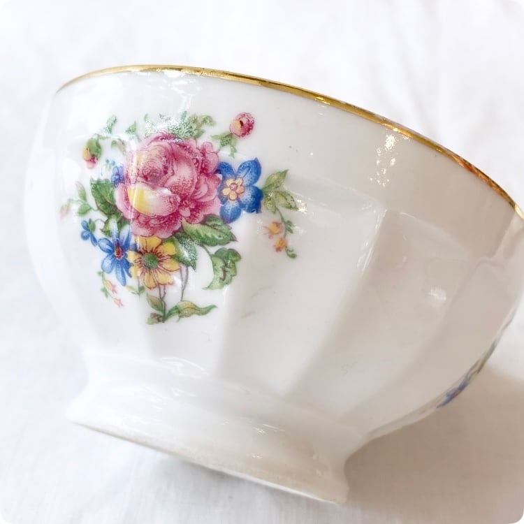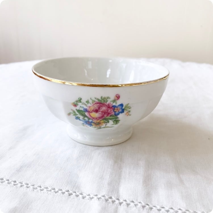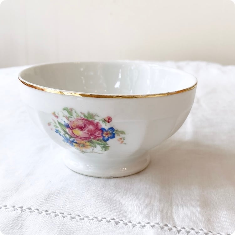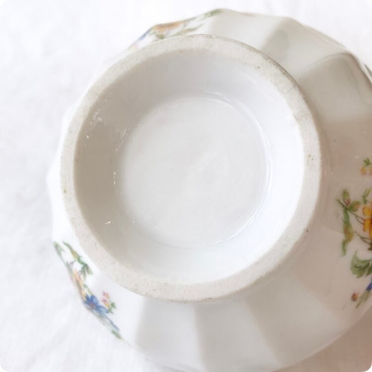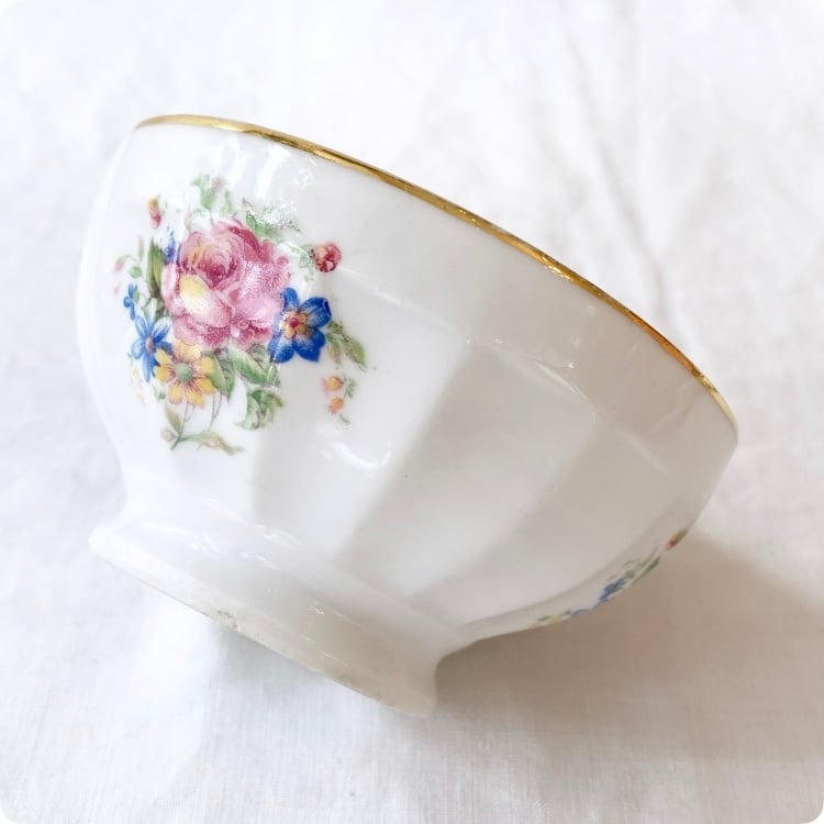 1900年代中頃につくられた、愛らしいお花のブーケが描かれたアンティークのミニカフェオレボウルです。