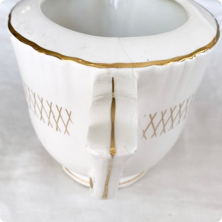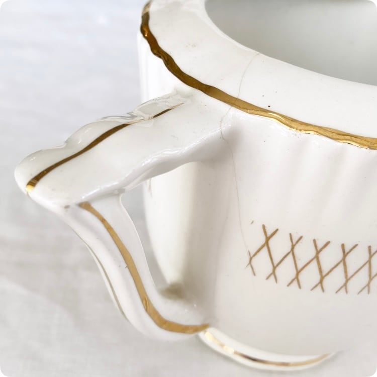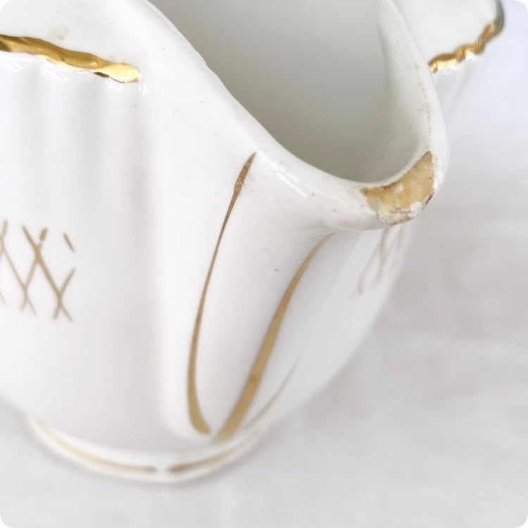 持ち手下部分から下方向に向かって薄っすらとキズが見受けられます。また注ぎ口と裏面淵に欠けが一箇所ございます。全体的にブロカント感があり、非常に風合いがましています。