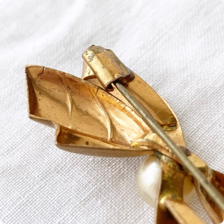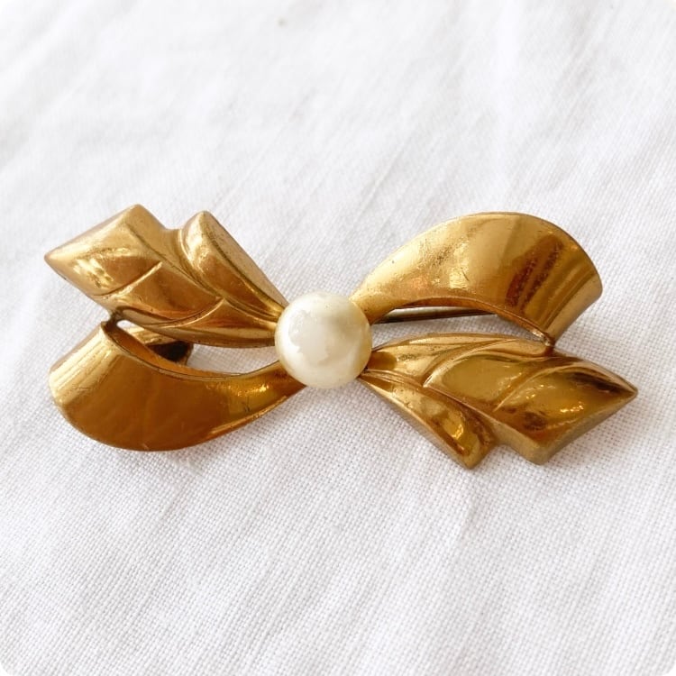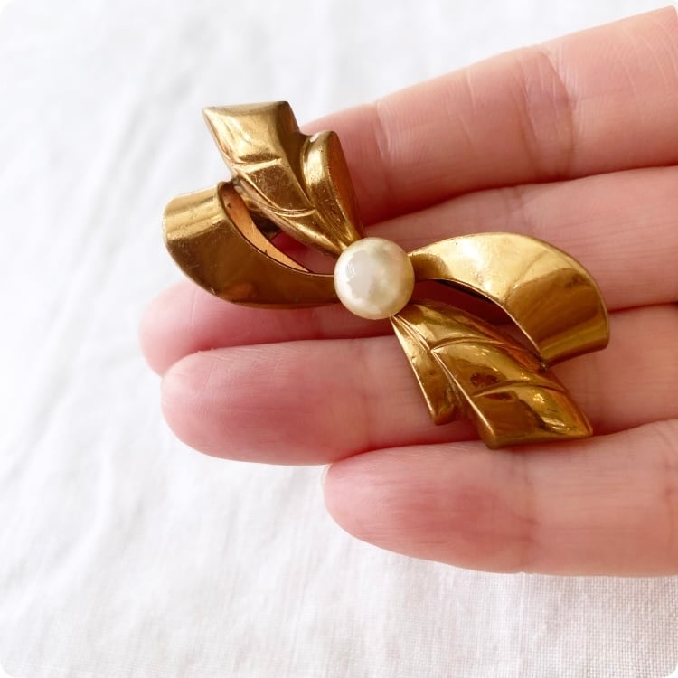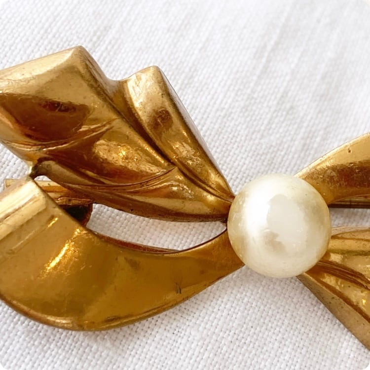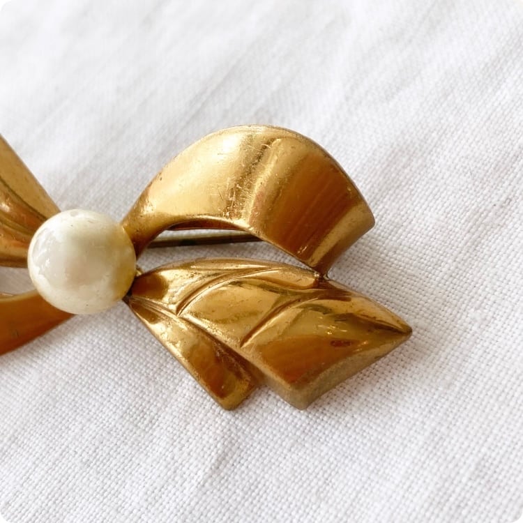 フランスヴィンテージ ブローチ | リボンモチーフ × パール ゴールドカラー |1950⁻60年頃