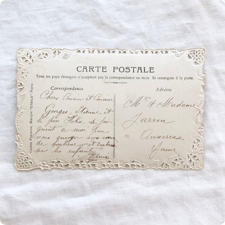 流れるような筆記体が美しく、古い時代を感じさせるこのポストカードは、心温まるストーリー性を秘めています。