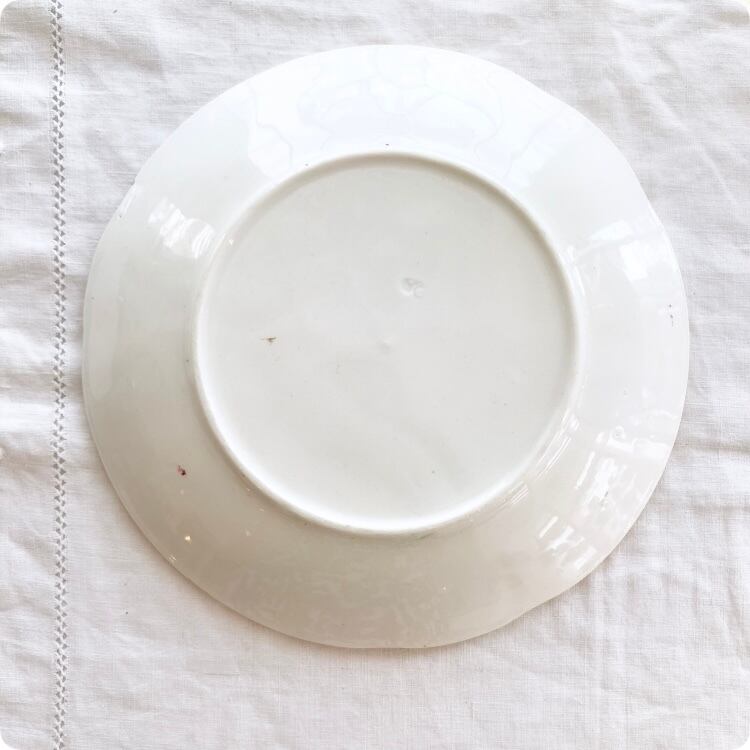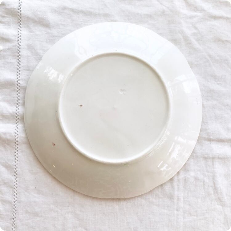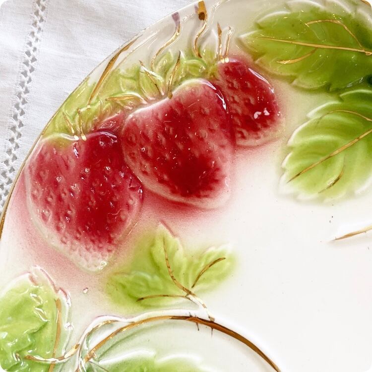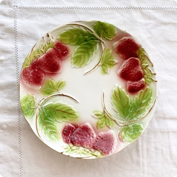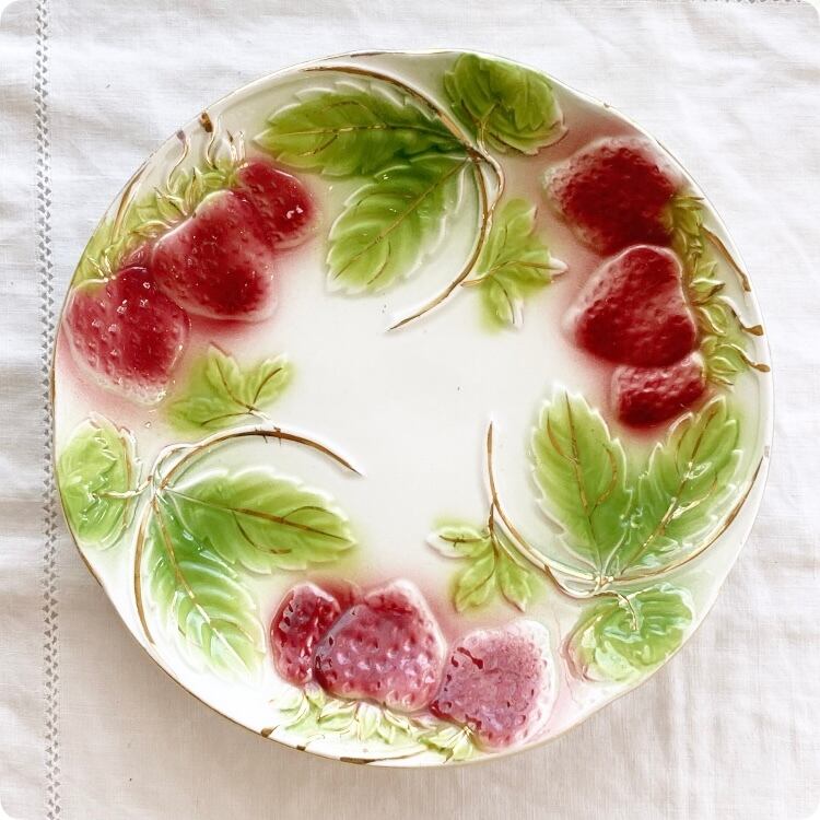 フランスの19世紀から20世紀初頭にかけて製造された、華やかで愛らしいイチゴ柄が特徴のアンティークバルボティーヌ皿です。