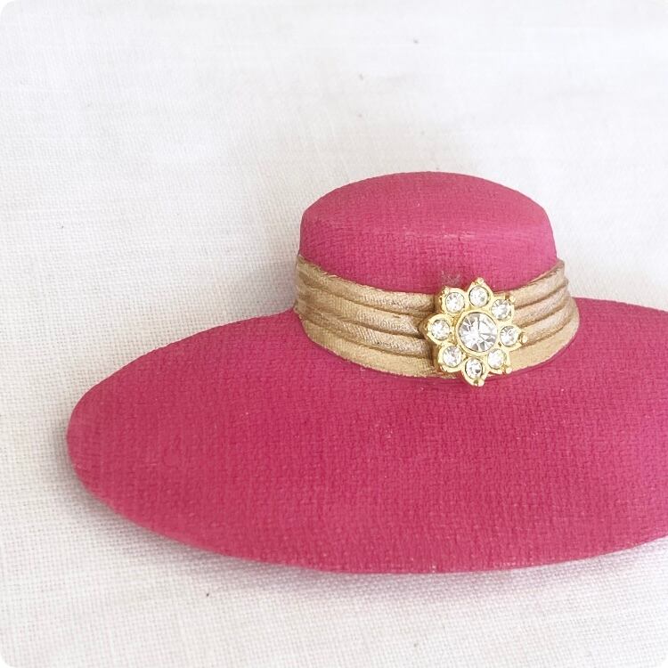 鮮やかなピンクカラーが目を引く、ミニチュア帽子モチーフはとても可愛らしく、エレガントな雰囲気を演出してくれますね。