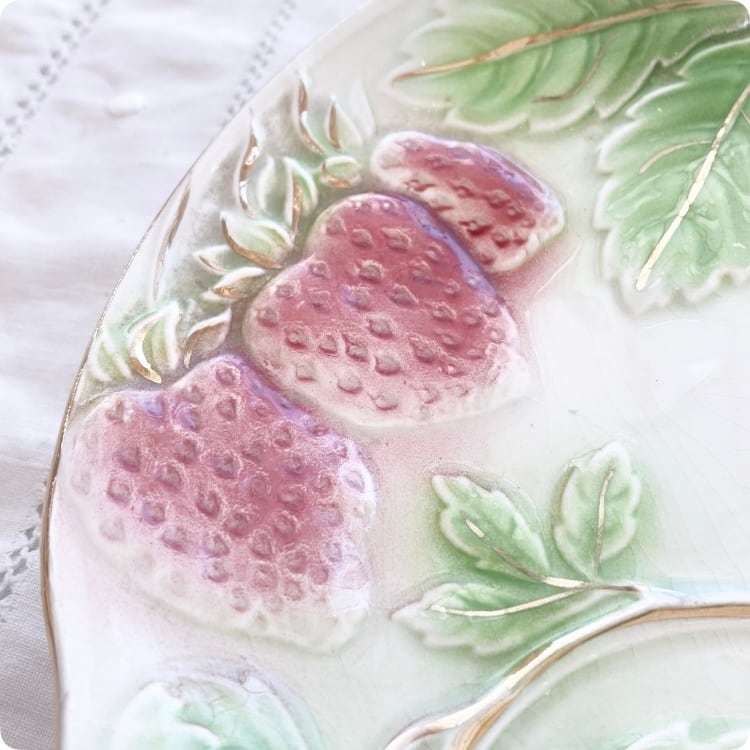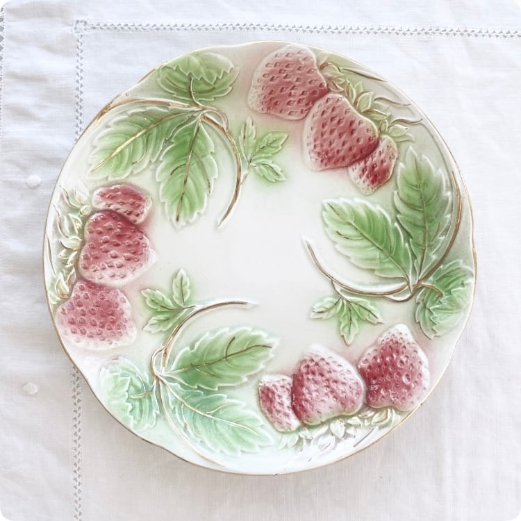 フランスの19世紀から20世紀初頭にかけて製造された、華やかで愛らしいイチゴ柄が特徴のアンティークバルボティーヌ皿です。