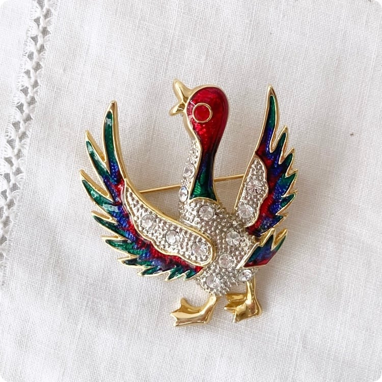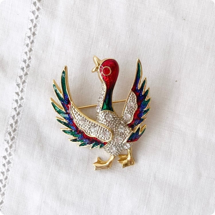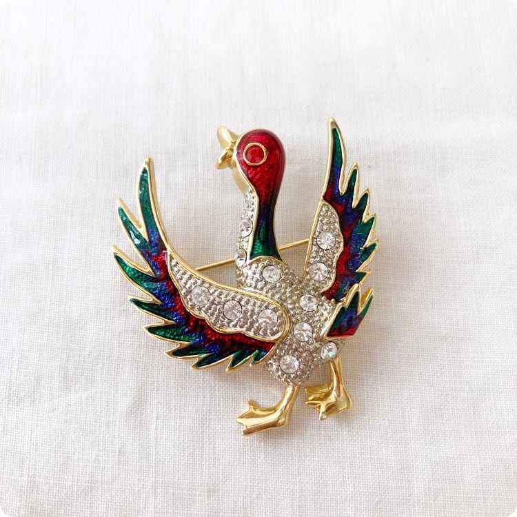 1900年代中頃から後半に製作されたこちらのブローチは、愛らしい鴨モチーフが視線を引き、鮮やかなマルチカラーのエナメルが装飾されています。