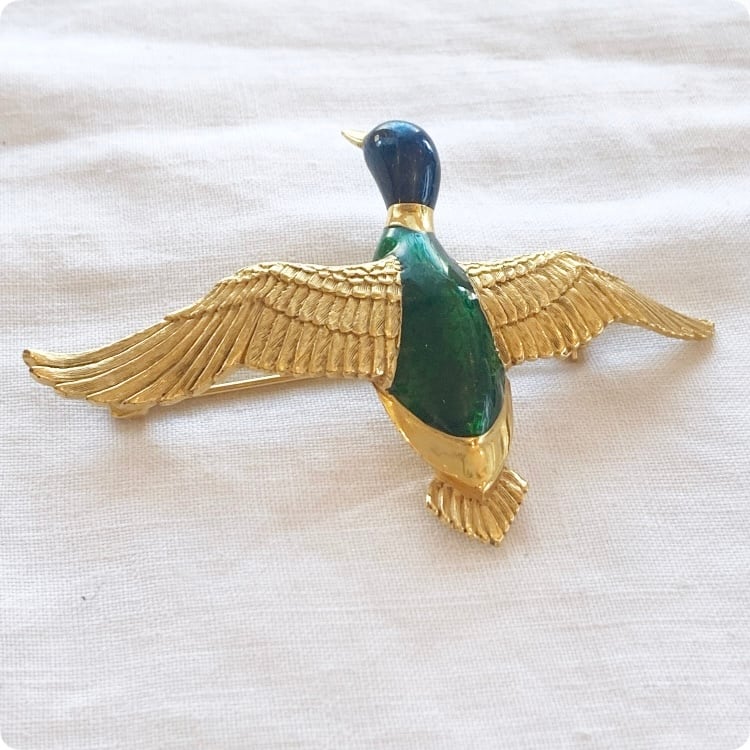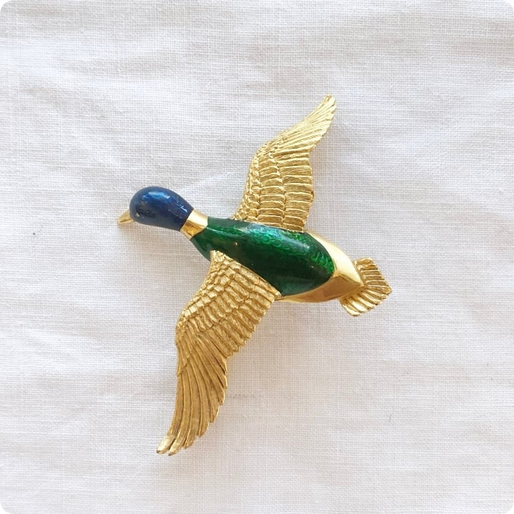 1900年代中頃に製作されたこのブローチは、エレガントで躍動感あふれる鴨モチーフが特徴です。
