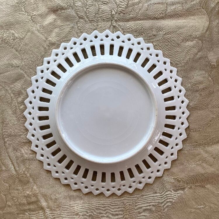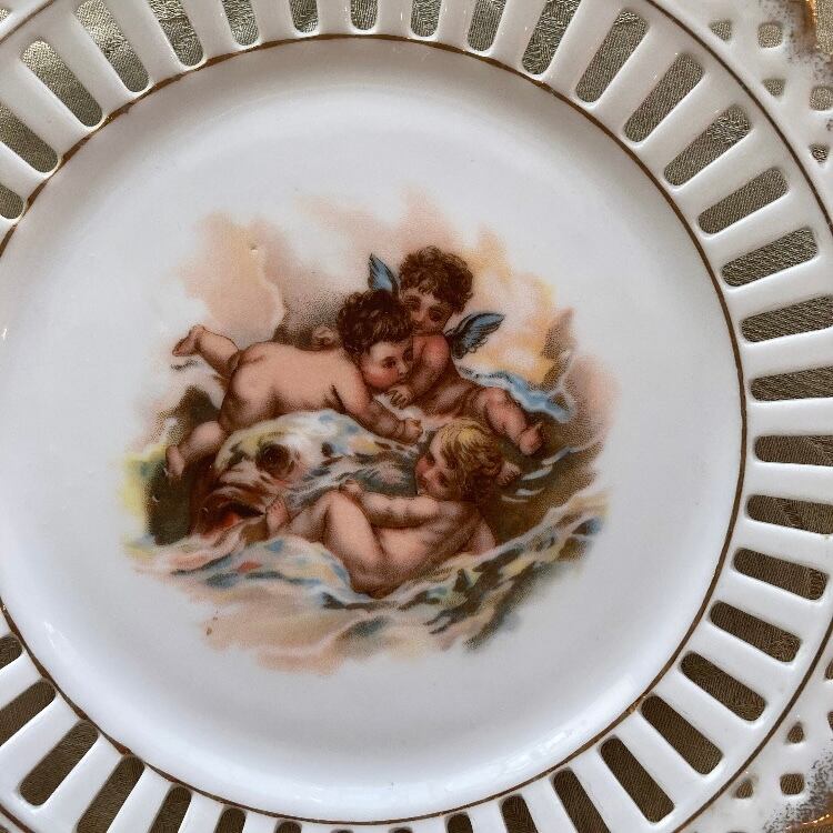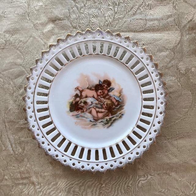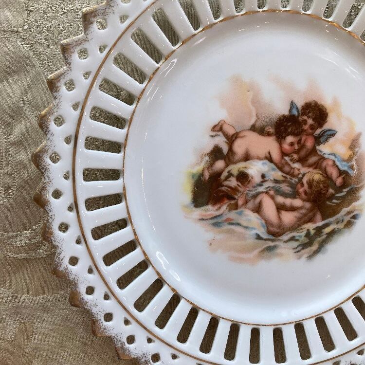 フランスから届いた、天使の絵柄とピアスドワークが施された魅力的なアンティーク皿です。