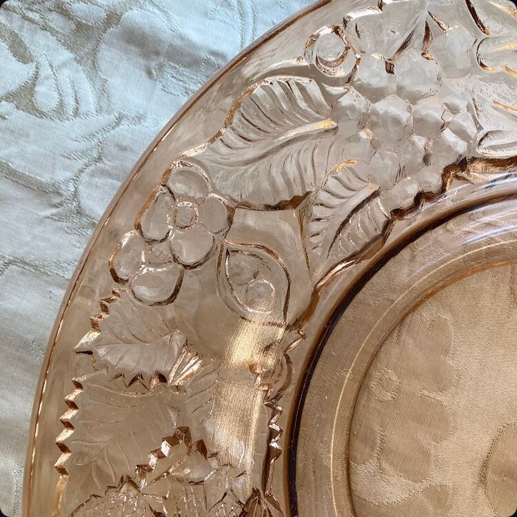 【フランス直輸入】大胆に描かれた絵柄に心奪われる コーラルピンクカラー ガラス皿 大